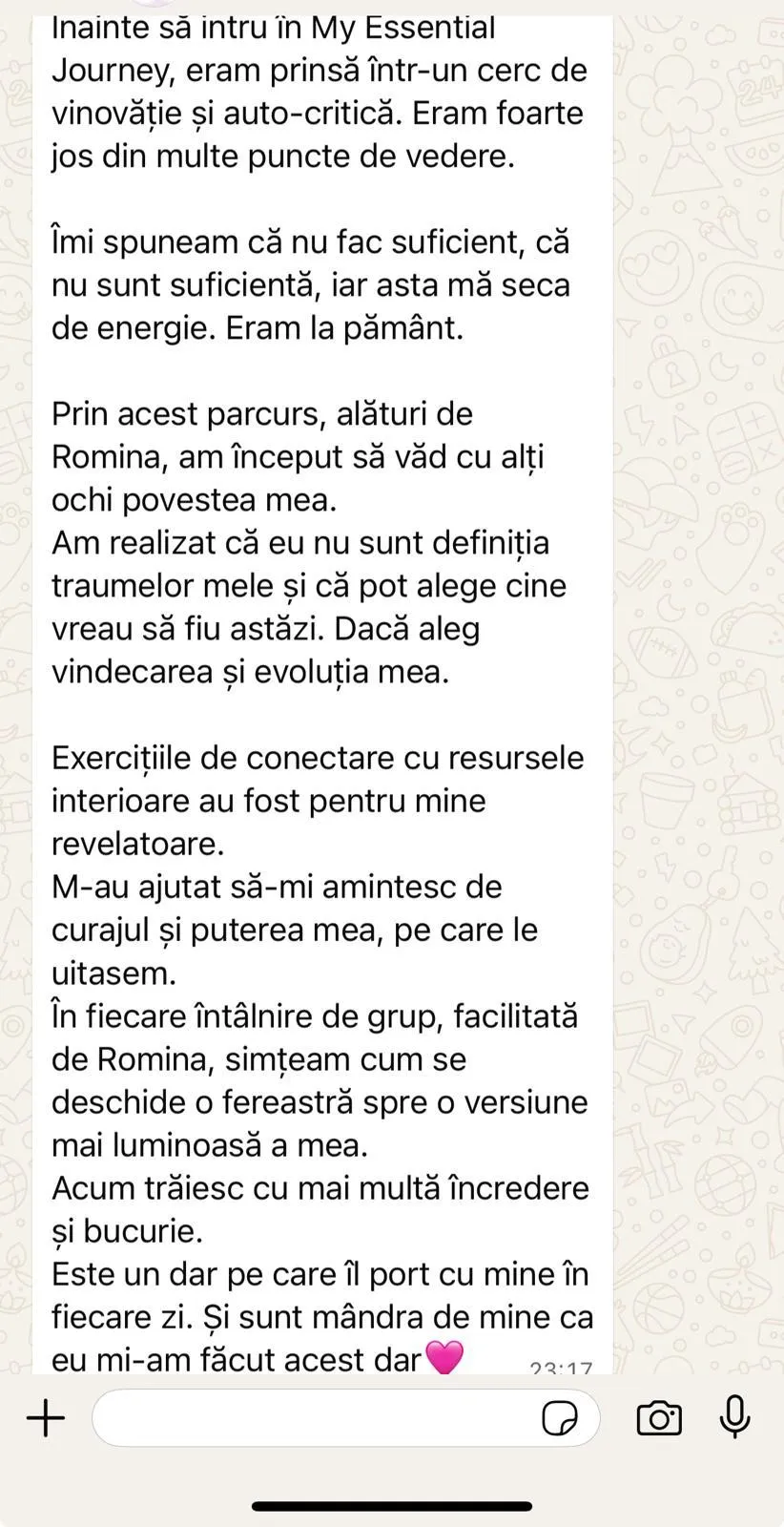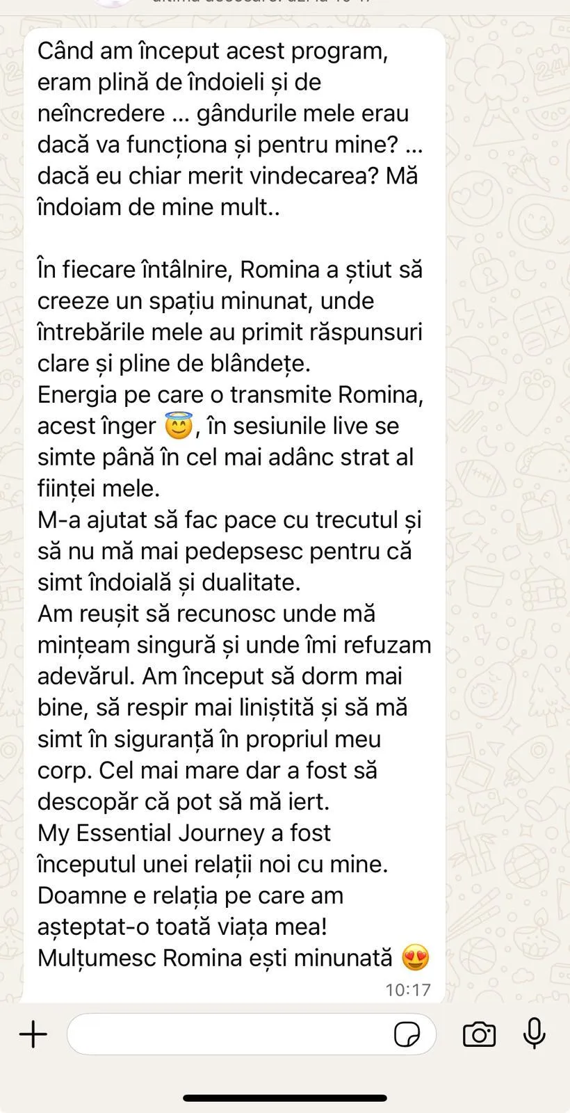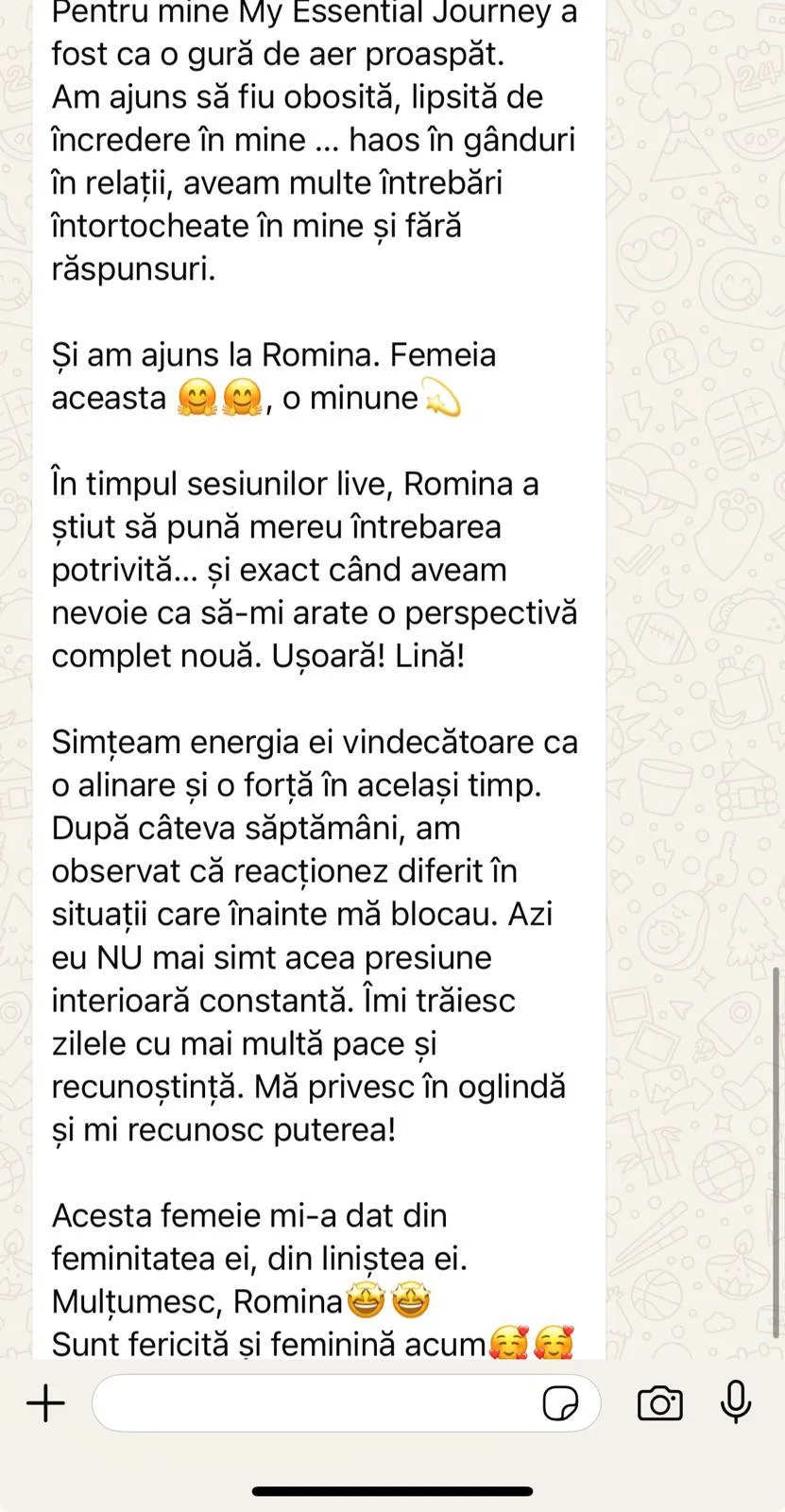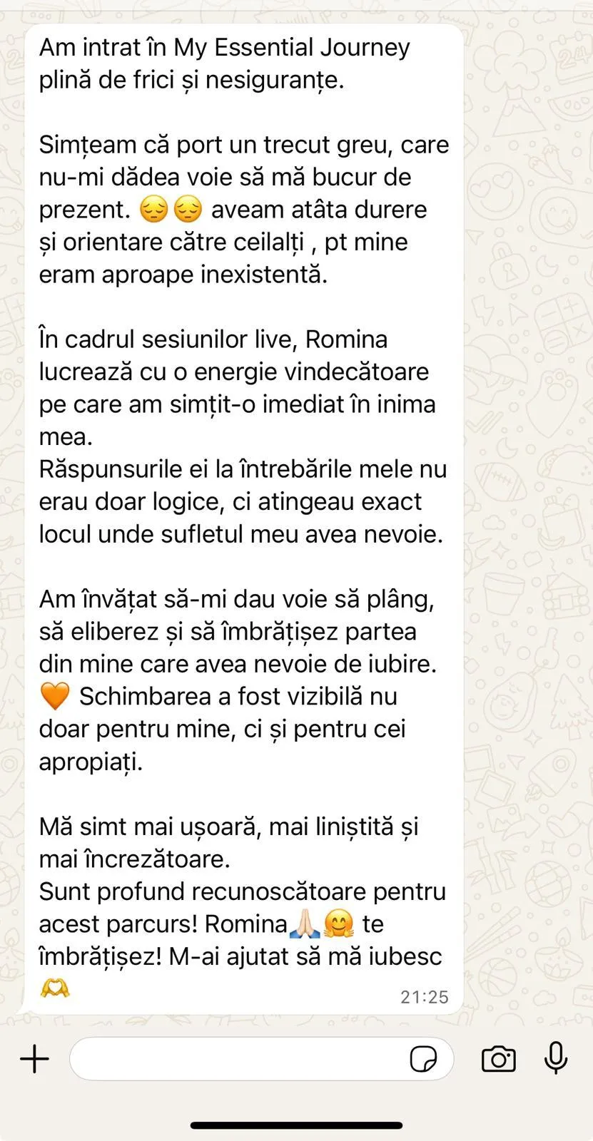 În 2021 când am primit primele mesaje de la Dumnezeu, am primit și acest mesaj: ,,Romina, am pus în tine energie vindecătoare și cu aceasta vei lucra cu oamenii și le vei deschide inimile,,.