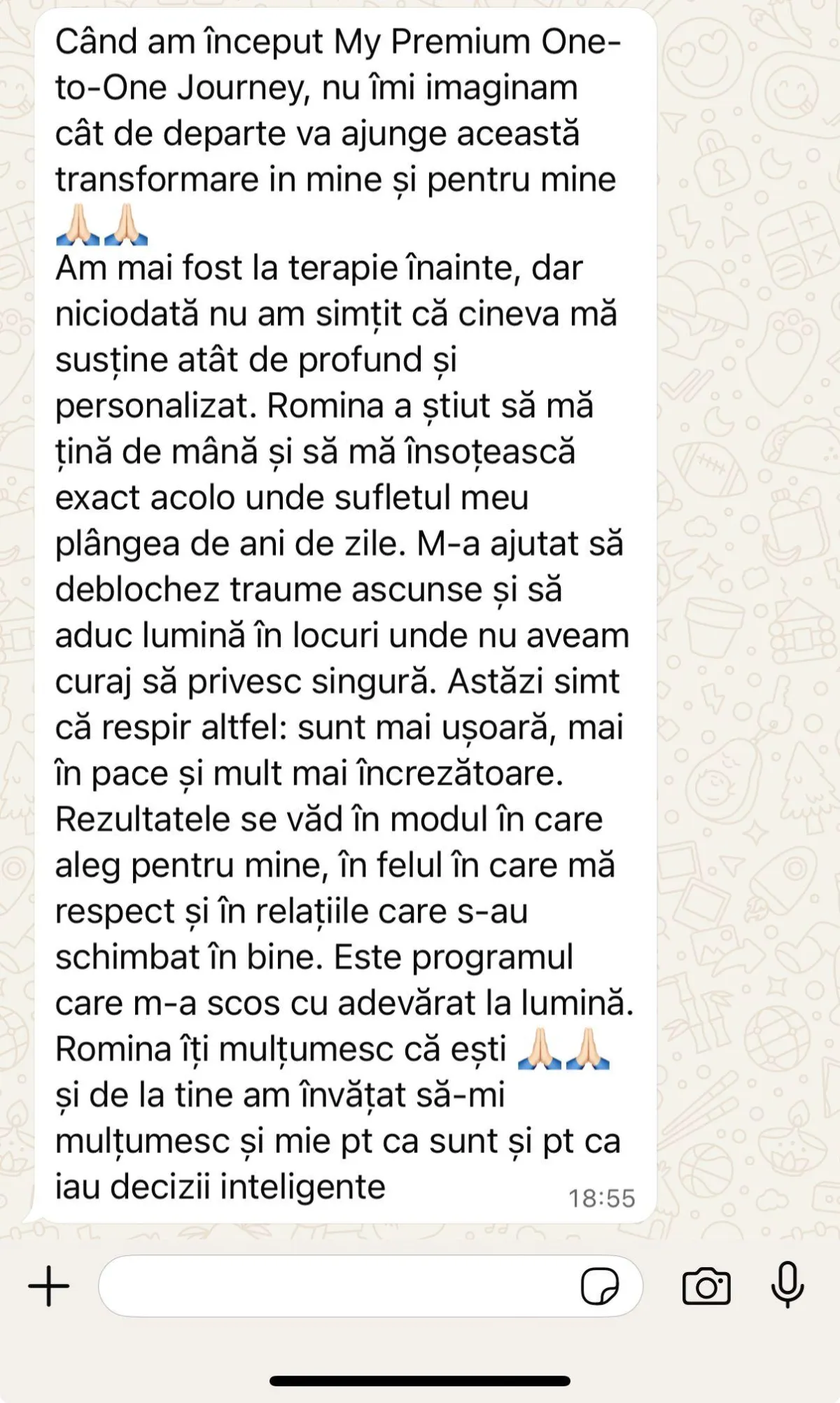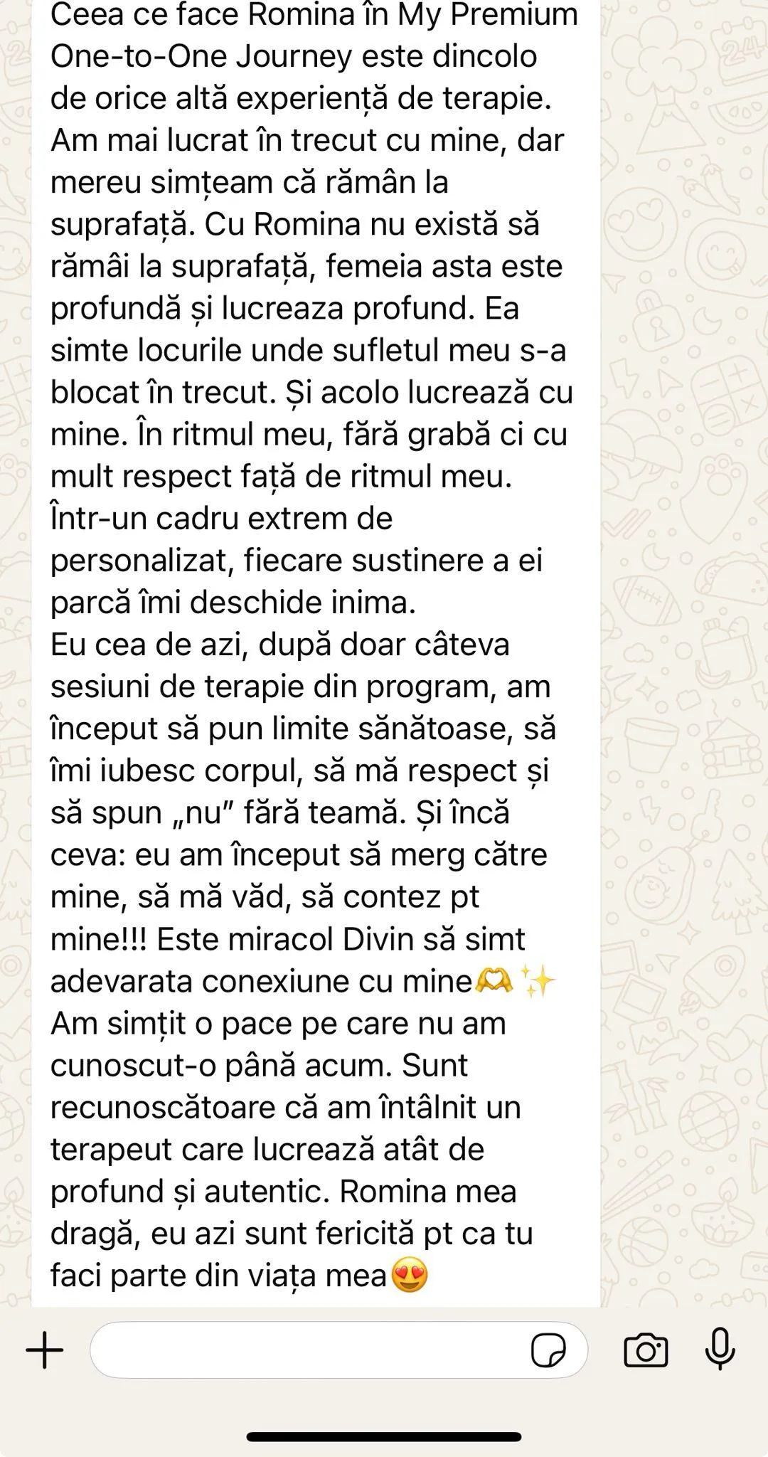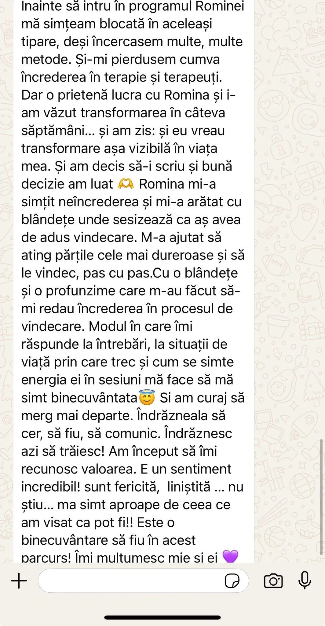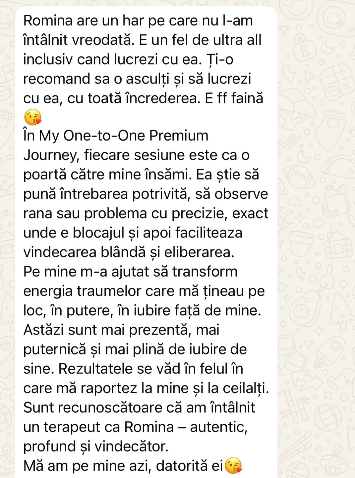 ✨ Dacă simți că ai ajuns într-un punct în care îți dorești cu adevărat să-ți transformi viața, să îți vindeci rănile emoționale, traumele și părțile din tine în durere, ca să creezi o viață prosperă, frumoasă, cu iubire și relații autentice care să te onoreze în profunzime, te invit să programezi apelul de calificare cu mine, Romina.